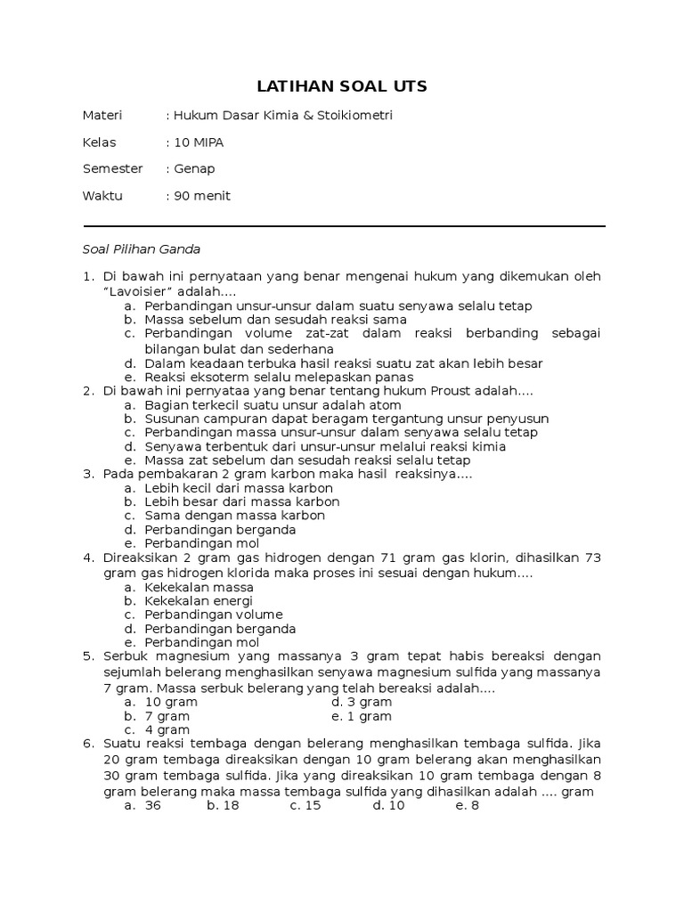 latihan soal hukum dasar kimia kelas 10 pdf